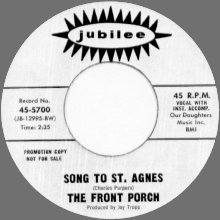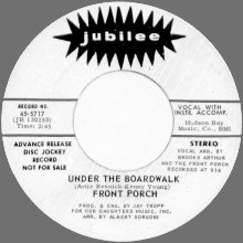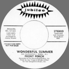 MS: "Wonderful Summer" and "Under The Boardwalk" were produced by Brooks Arthur with arrangements by Jimmy "The Wiz" Wisner. None of us played on those tracks. It was all session guys, hence the difference in sound. Brooks Arthur has more gold and platinum than Tiffany's, including all of Adam Sandler's recent comedy records. PP: In my search for information on the Front Porch, I had even asked Al Gorgoni, who was on the two "cover" 45's, if he remembered anything about the group, but your answer explains why he didn't - he wasn't at the vocal sessions! MS: I think he worked a lot at Century Sound with people like Artie Butler and Artie Kornfeld. PP: By the way, Al Gorgoni is still in business, doing what he always did. I forget the name of his company, but he put out a new Evie Sands album a couple of years back, maybe 3 or 4. She still sounds great. MS: I went to junior high school with Evie Sands, although she had a different name [Evie Rosen] back then. I think she was a grade lower then I was, and her brother was a grade higher. Also there was another singer, Bobby Pedrick Jr., who was a friend from kindergarten, that went to the same school and had several hit singles, "White Bucks And Saddle Shoes" and "Stranded", on Big Top Records. He became Robert John, and hit again with "The Lion Sleeps Tonight" and "Sad Eyes". I also went to high school with Bobby Rivera, of Little Bobby Rivera & the Hemlocks, who did "Cora Lee" [a New York doo-wop classic]. PP: Are there any stories you'd be willing to share about the "care and treatment" of the Front Porch by Jubilee? I always thought the recording and the label to be an odd match. MS: I always thought our releases on Jubilee were a strange match, too.