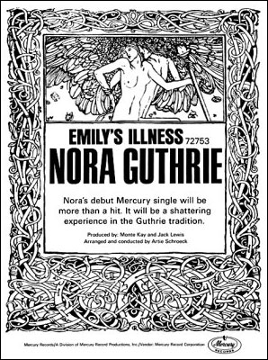 make me drink and then things start to get weird. "Emily's Illness", a forgotten 45 from late 1967 recorded by a 17-year-old non-singer named Nora Guthrie, is an overpowering musical force. In the three-minute span from its opening harpsichord down-note to its double-reverse coda, "Emily's Illness" expands to occupy all attention, saturating its environment to the extent that music and listener are ineluctably fused into one unit. Late